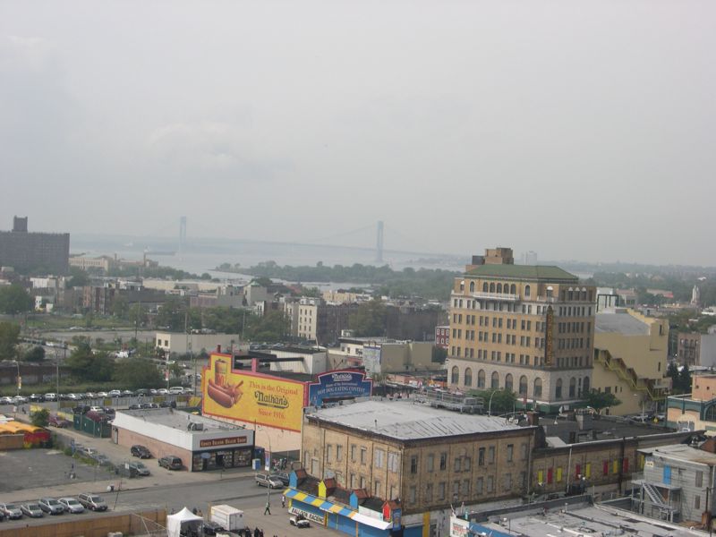 The back of Nathan's is seen in this view. The tall building to the right is the Coney Island Theater Building. Built in 1925, during one of Coney's revival periods. It housed a Loew's Theater which closed in the 1970s. In the distance is the Brooklyn Bridge.