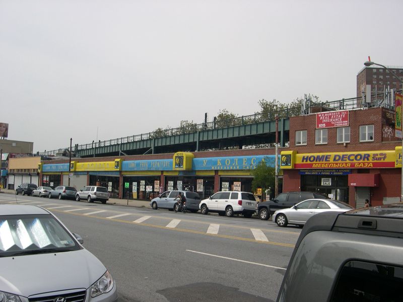 This spot on Surf Ave, was near the entrance to the famed Luna Park. A strip of Russian businesses occupy the former location. One is even named "Luna Park Furniture". The elevated subway can be seen above. This portion of the line follows the right-of-way of the old Prospect Park & Coney Island Railroad which ran at ground level to the pier at Norton's Point.