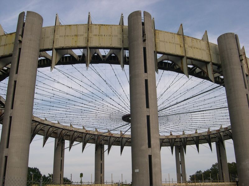 The New York State Pavilion consists of three main components, each with its own purpose, rather than being one single building intended for multiple uses. The largest structure in the complex is an elliptical plaza measuring 350 feet by 250 feet. This space is surrounded by 16 steel columns (each one hundred feet high), which once held up a colorful canopy that covered the plaza underneath.