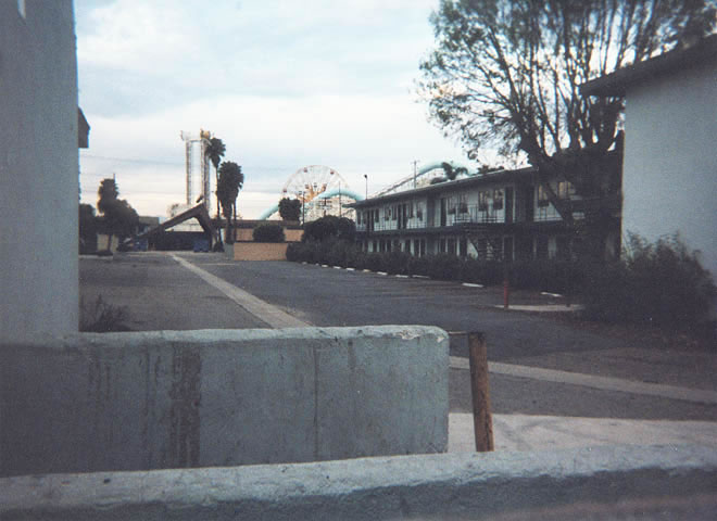 The Golden Forest Inn during renovationsLooking north again we see the steel boomerang entryway into the motel. I thought it was interesting that there were no pictures of that in the brochure. I guess by the early 70s, the whole Googie thing was seen as being dated and garish. Previous | Home | Next |