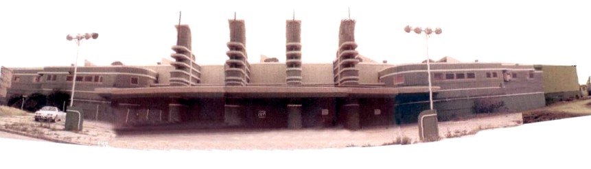 Behind that fabulous facade was a large but modest rectilinear wooden structure resembling an overgrown gymnasium both inside and out. Covering 100,000 square feet and comfortably seating up to 6000, the Pan-Pacific was Los Angeles' primary indoor venue until the 1972 opening of the much larger Los Angeles Convention Center. The Pan-Pacific Auditorium then closed for good. It stood lonely, neglected and damaged by small fires accidently started by transients for years afterward, but not forgotten. Almost immediately after the auditorium closed, much talk circulated throughout the surrounding Fairfax District neighborhood about refurbishing the Pan-Pacific, possibly as an ice rink or cultural center even though the parking lot would soon become the site of a park. Serious considerations remained, namely the sheer size of the building and its now-missing parking lot. Talks would drone for years while the Pan-Pacific continued its downward spiral. |