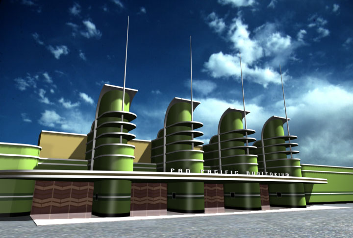 Although the original Pan Pacific auditorium burned down in 1989, the exterior of the new structure in the Pan Pacific Park closely resembles the Streamline Moderne exterior of the former building. BACK * NEXT |